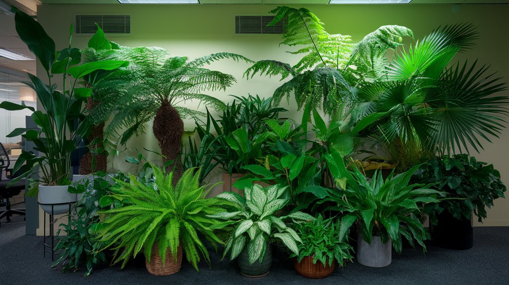 Consider using self-watering pots or moisture-retaining soil blends to stabilize hydration levels. These strategies guarantee peak plant vitality, maintaining lush, thriving greenery in your climate-controlled office environment.