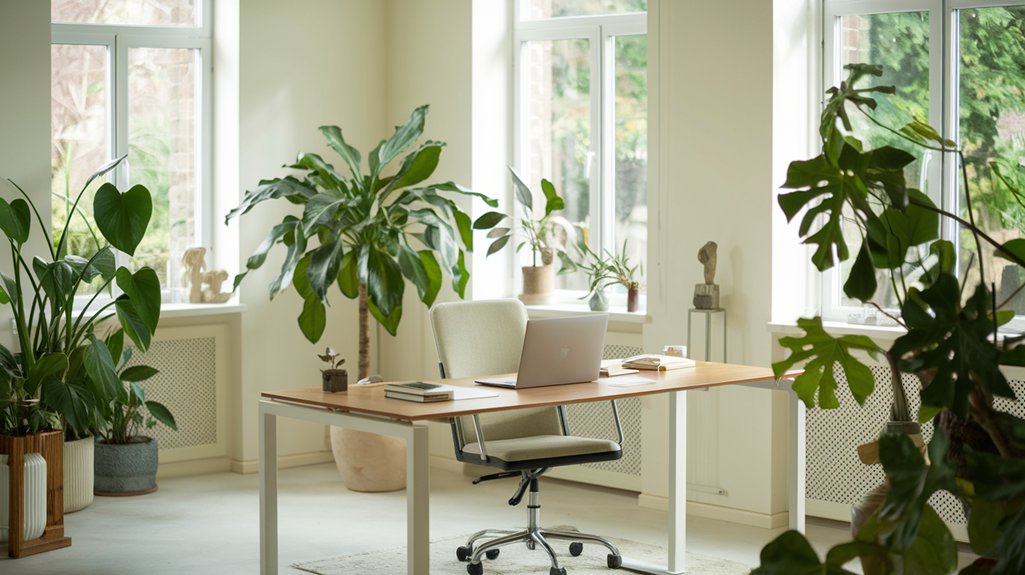 Their calming effect and connection to nature are essential for mental health, especially in low light conditions. Integrating these natural elements elevates both comfort and engagement in your home office setup.