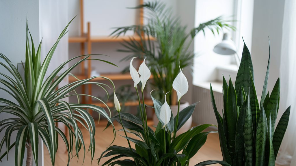 To keep popular air-cleansing houseplants healthy, cater to their specific light needs. Snake plants and Golden Pothos thrive in bright, indirect light but tolerate low light; however, do avoid direct sunlight to prevent leaf scorching. Peace Lilies prefer medium-to-low indirect light, ensuring their iconic blooms. Spider plants enjoy filtered bright light and adjust to lower light, albeit with slower growth. English Ivy needs moderate sunlight but adapts to less. Discover how to maintain ideal conditions for peak performance.
