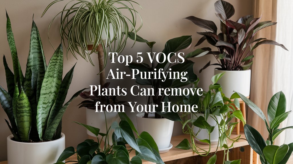 Air-purifying plants are essential for removing VOCs such as formaldehyde, benzene, trichloroethylene, xylene, and toluene from your home. The Peace Lily excels in filtering formaldehyde and benzene, while Snake Plants absorb formaldehyde, benzene, and toluene. English Ivy is effective against trichloroethylene, and Boston Ferns thrive in absorbing xylene. By strategically incorporating these plants, you can efficiently reduce VOCs, enhancing indoor air quality. Discover how each plant targets specific VOCs for a healthier home.