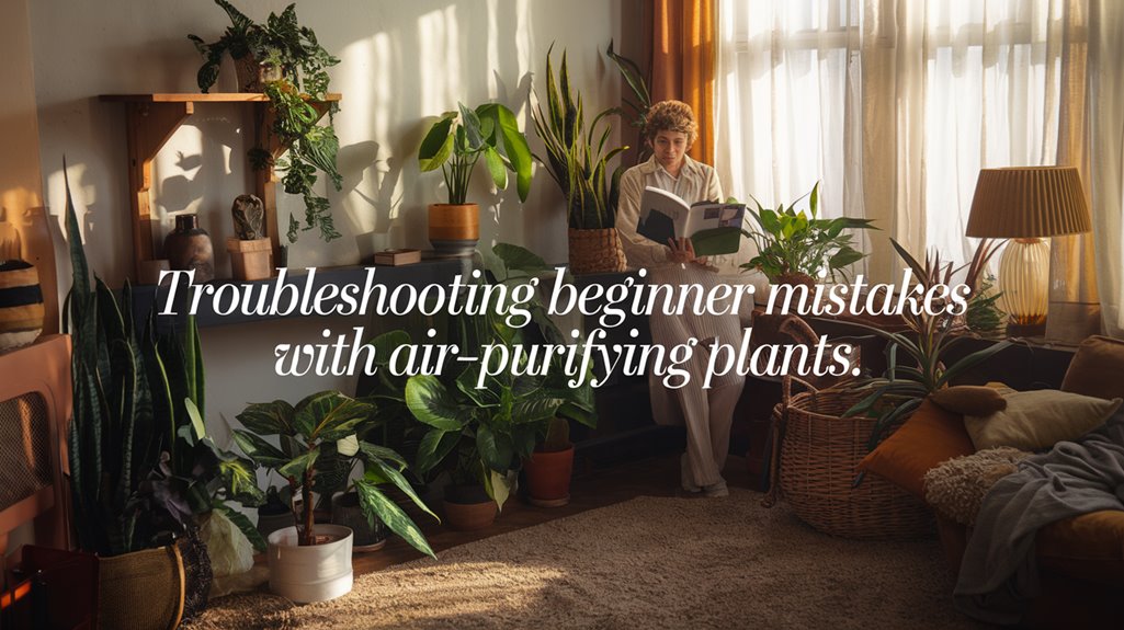 Avoid common pitfalls when caring for air-purifying plants by managing their watering needs; allow the top inch of soil to dry before rehydrating to prevent root rot. Maintain a stable environment to reduce stress, and guarantee you’re meeting each plant’s specific lighting requirements. Regularly prune to enhance growth and check for pests. Proper soil and drainage are essential, adjusting watering seasonally. The right techniques will keep your plants healthy and thriving—there’s more to learn.